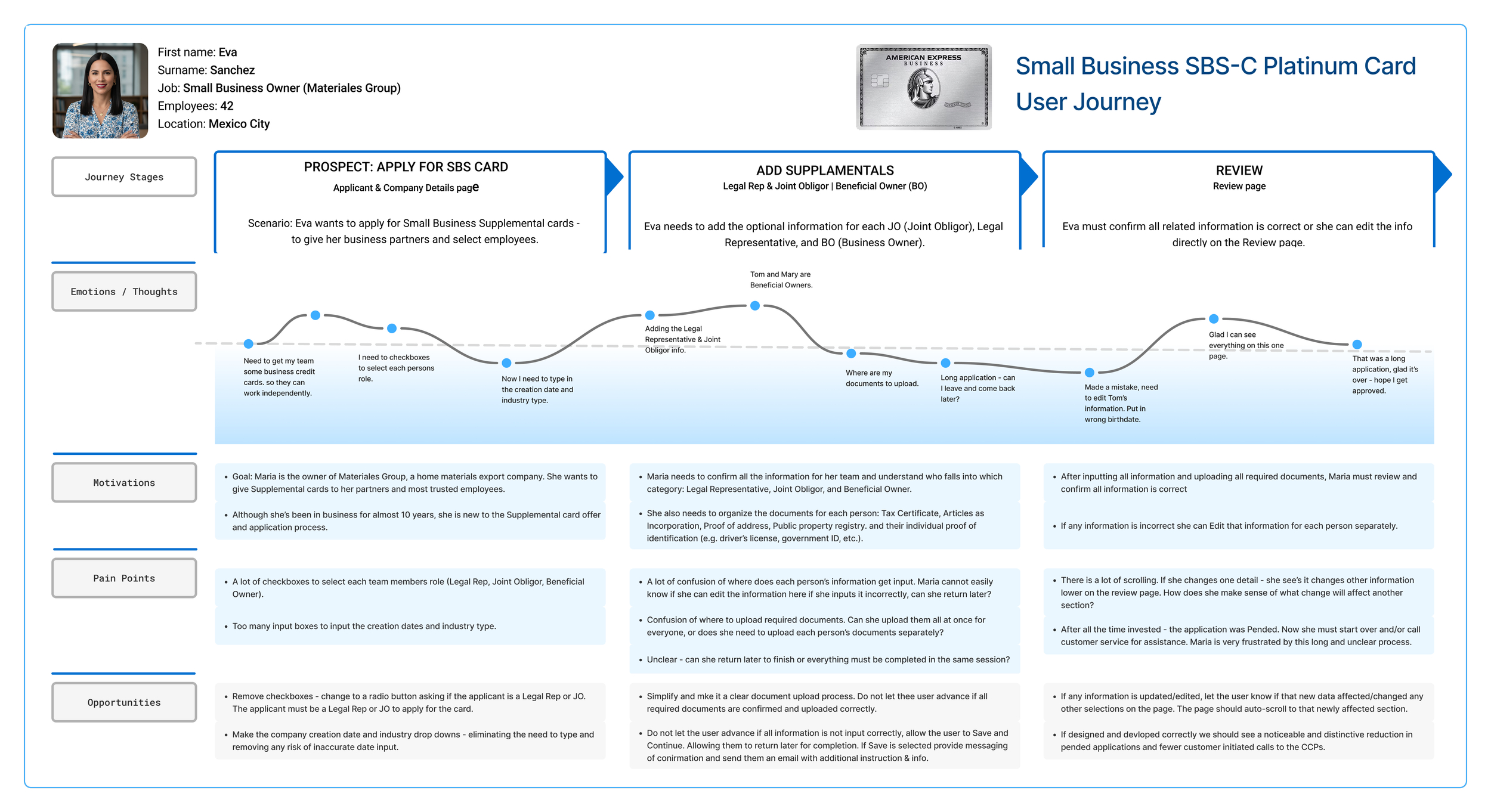 American Express aimed to redesign its Mexico Small Business Supplemental (SBS) Card Application. The goal was to streamline a complex, confusing process that was negatively impacting completion rates, customer satisfaction, and revenue.